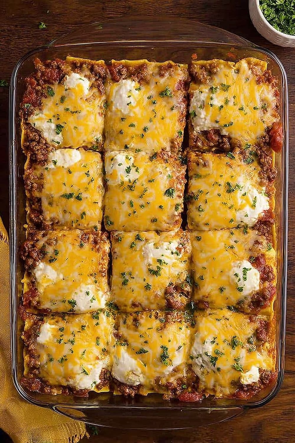 - 13 Top the final layer with the 1 cup cheddar cheese and ½ cup parmesan cheese, creating a golden, bubbly top when baked.