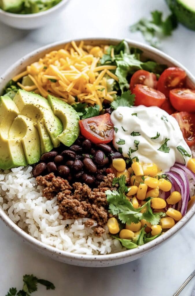 The hearty mix of seasoned ground beef, cilantro–lime rice, and colorful toppings makes for a satisfying and nutritious meal. You can easily adjust the ingredients to suit your taste or dietary needs. Whether you prefer extra spicy or mild, loaded with veggies or heavy on the cheese, these burrito bowls are sure to become a new favorite in your recipe rotation.