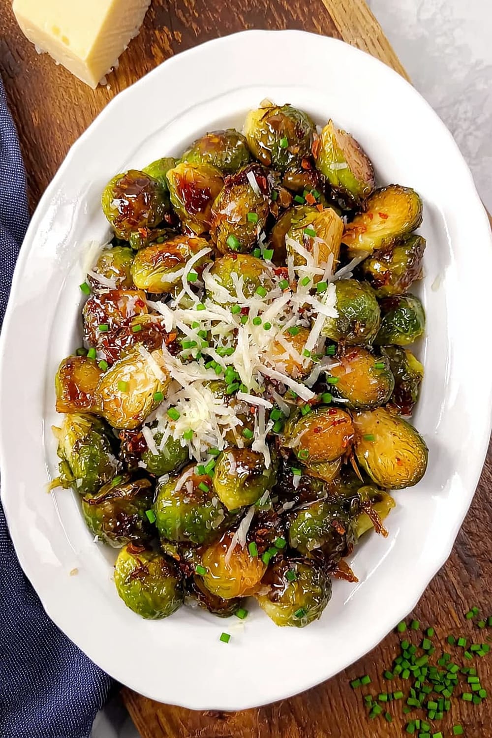 - Transfer the roasted Brussels sprouts to a serving dish and immediately top with freshly shaved Parmesan cheese and chopped chives. The residual heat will slightly melt the cheese, creating the perfect finishing touch.