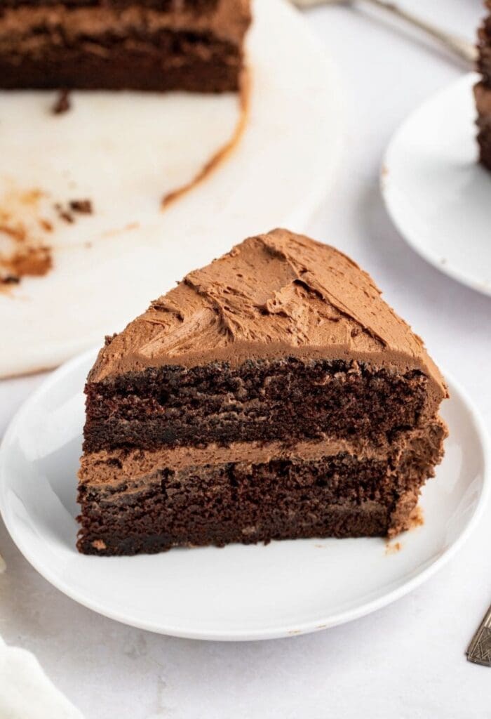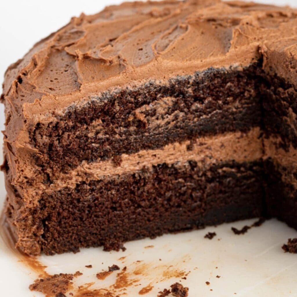 The recipe makes a big 9-inch layer cake that serves 24 people. You’ll only need about 30 minutes to mix it up and 20 minutes to bake. The hardest part is waiting for it to cool before frosting! With rich cocoa flavor and a creamy chocolate frosting, this cake is sure to be a hit at your next party or family gathering.