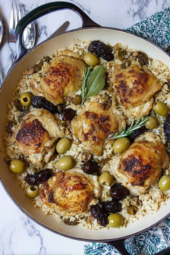 Picture this: tender chicken thighs with crispy skin nestled in a bed of perfectly cooked rice that’s absorbed all those incredible Mediterranean flavors from olives, capers, and sweet prunes.