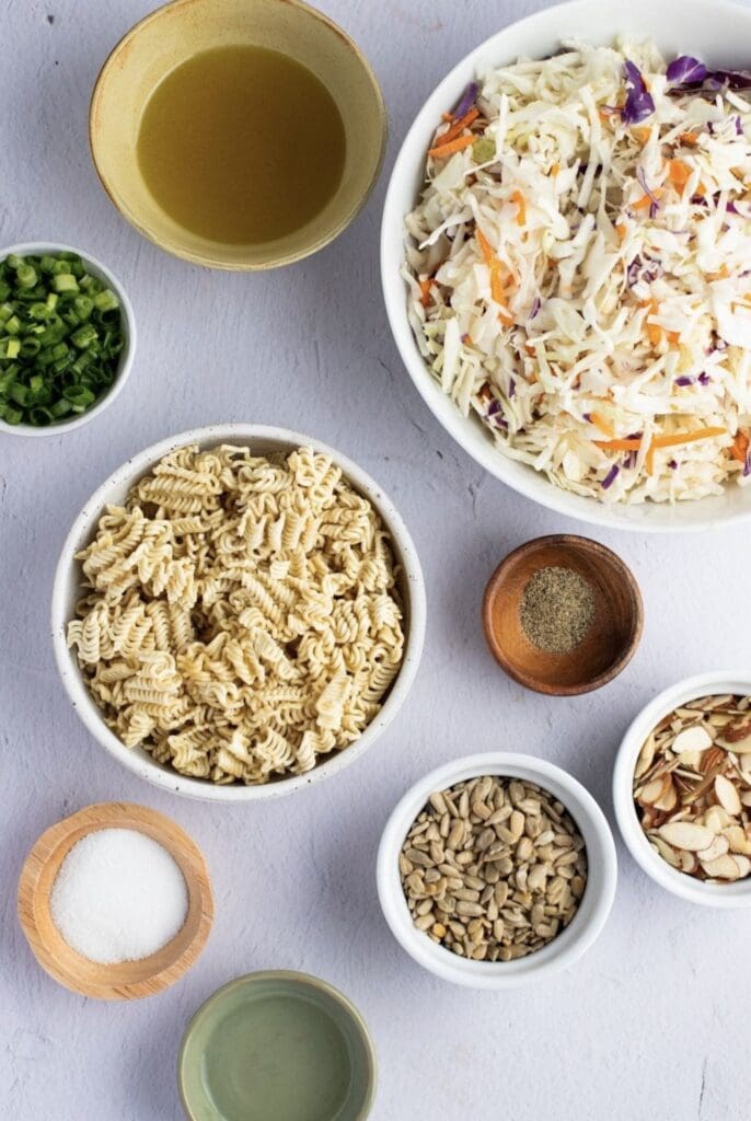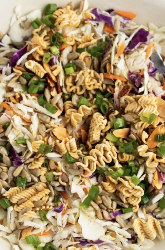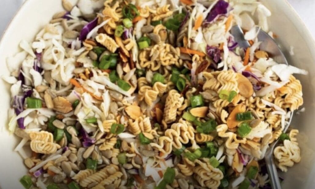 This Ramen Noodle Asian Salad recipe uses simple ingredients you can easily find at your local grocery store. The salad combines crunchy vegetables with toasted noodles and nuts, while the dressing adds a tangy, savory flavor.