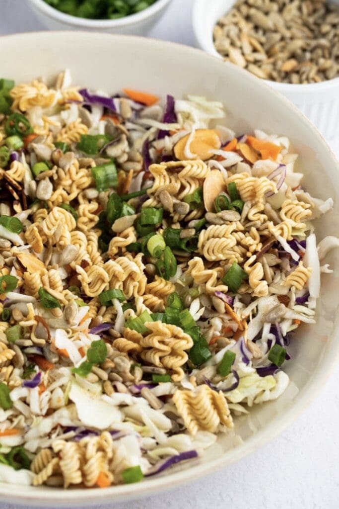 For the crunchiest salad, toast the ramen noodles, sunflower seeds, and almonds until they’re golden brown. Keep a close eye on them to avoid burning.
