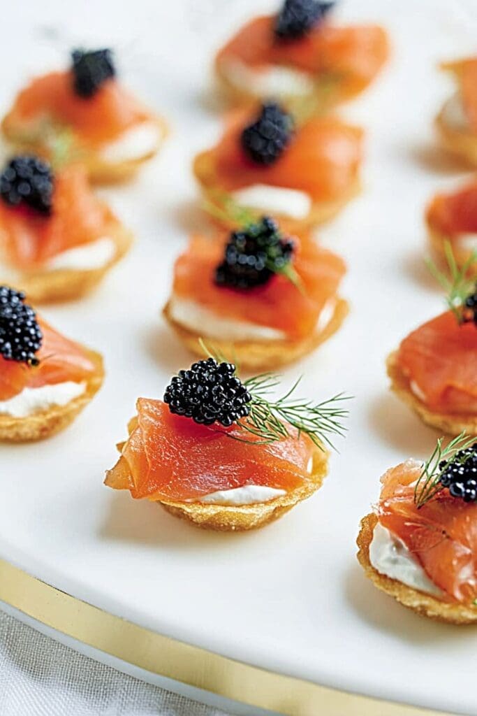 Build a Titanic-themed dinner party starting with these canapés, followed by beef Wellington or roasted duck as the main course. For brunch entertaining, serve alongside eggs Benedict, fresh fruit, and Danish pastries. Create a Scandinavian feast with Swedish meatballs, rye bread, and lingonberry sauce. New Year’s Eve menus shine with these canapés followed by rack of lamb and chocolate soufflé.