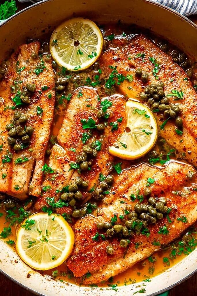 Roasted asparagus with garlic and lemon zest creates perfect flavor harmony while adding vibrant color and crisp texture contrast. Wild rice pilaf with herbs provides nutty, earthy flavors that complement the fish without competing. Sautéed baby spinach with garlic offers iron-rich nutrition and wilts beautifully under the piccata sauce. Herb-roasted fingerling potatoes add satisfying substance and soak up the delicious caper sauce perfectly.