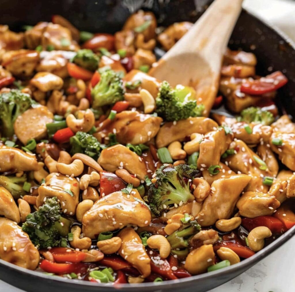 These ingredients will give you a mix of tender chicken, crunchy veggies, and nutty flavors. The sesame seeds add a nice touch at the end.