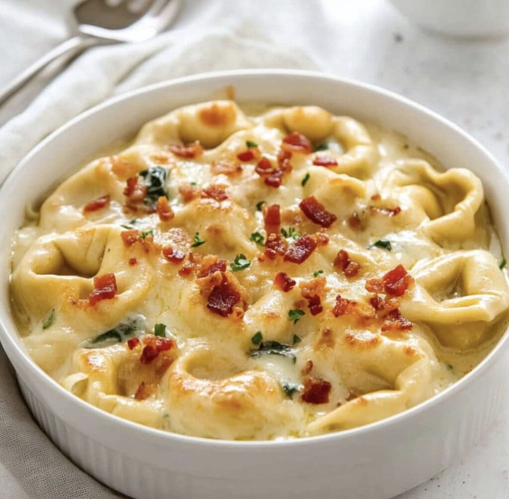 You’ll need cheese tortellini, bacon, and lots of yummy cheese for this dish. The sauce is made with heavy cream, milk, and spices. You can add spinach if you want some greens. It’s baked until the cheese is melted and golden on top.