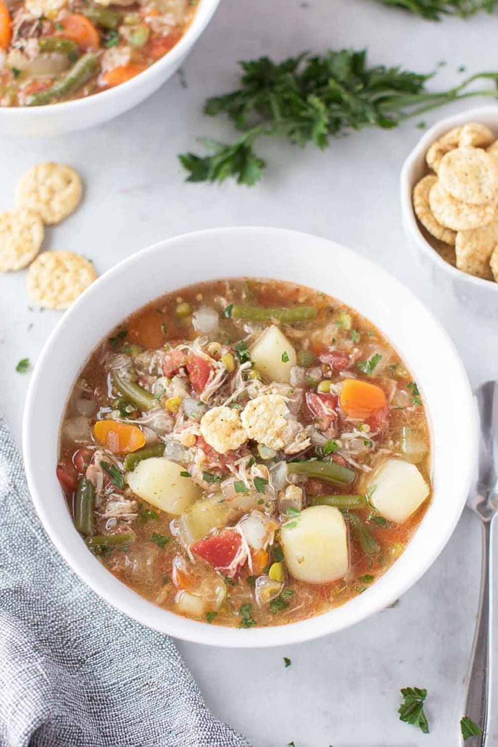 - Add the sliced celery, chopped carrots, chopped potatoes, shredded cabbage, diced tomatoes (with their juice), frozen green beans, frozen corn, frozen peas, bay leaves, the remaining 4 cups water, Worcestershire sauce, and soy sauce to the pot. Stir gently to combine all ingredients.