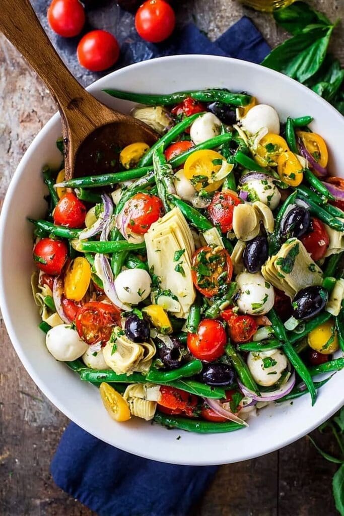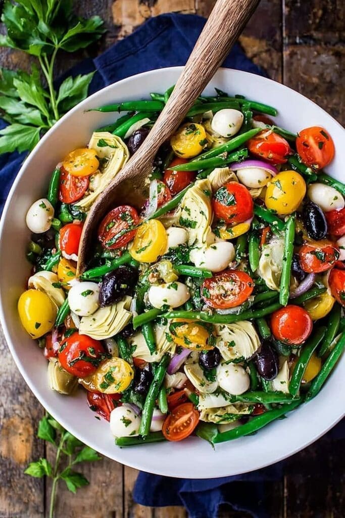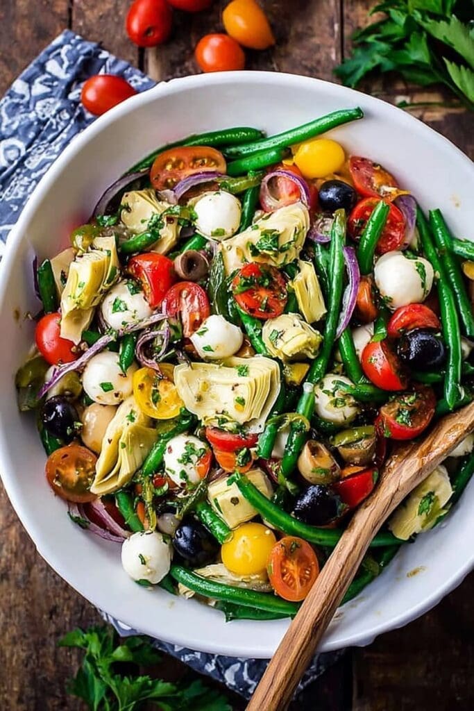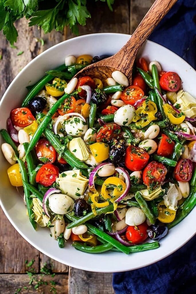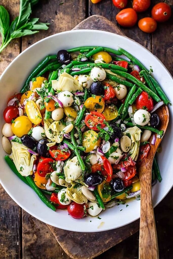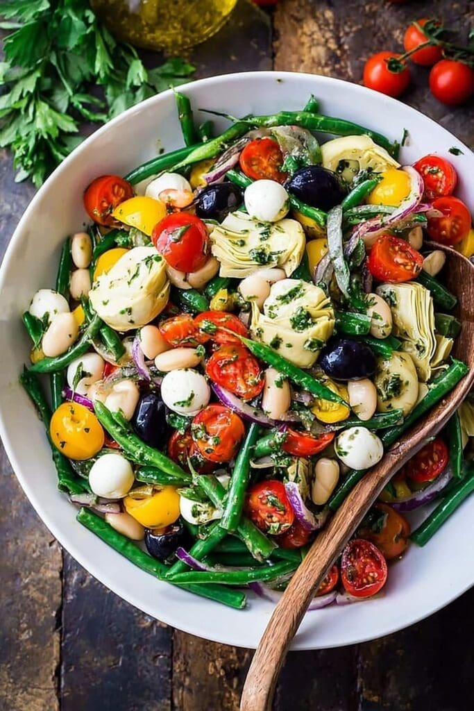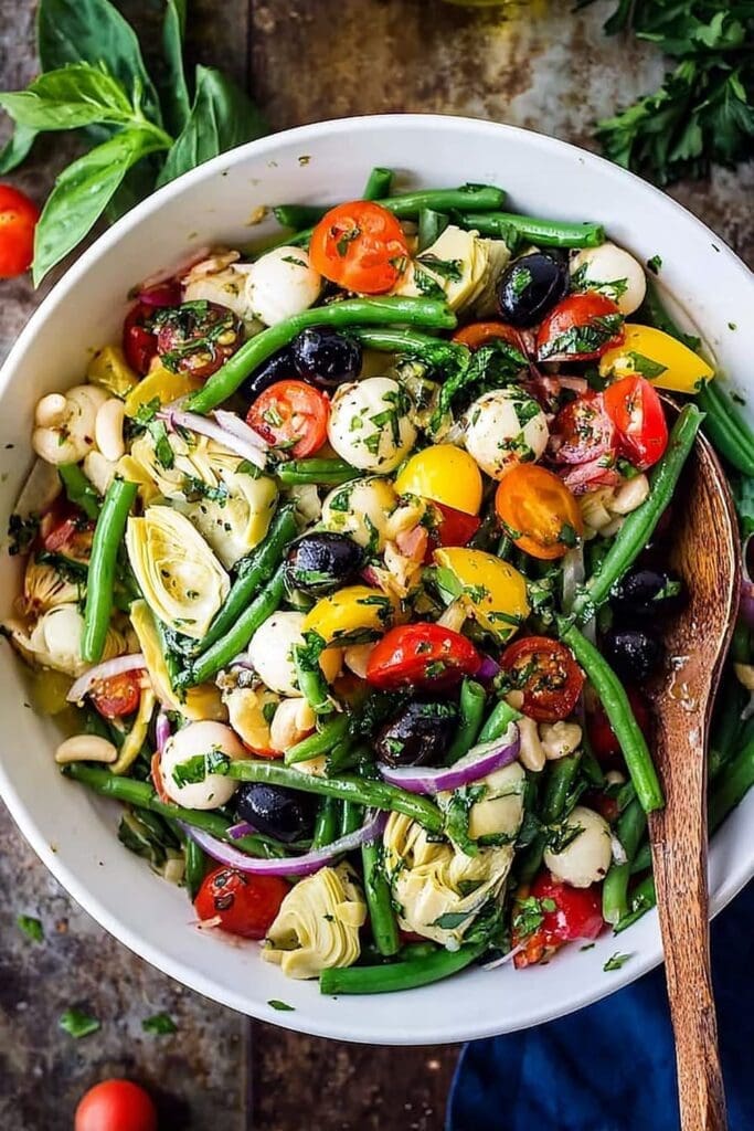 - 3 In a large mixing bowl, combine the blanched and cooled green beans with the drained white beans (or tuna if using), drained artichoke hearts, and drained olives. Using a large spoon or tongs, gently mix these base ingredients to distribute them evenly throughout the bowl.