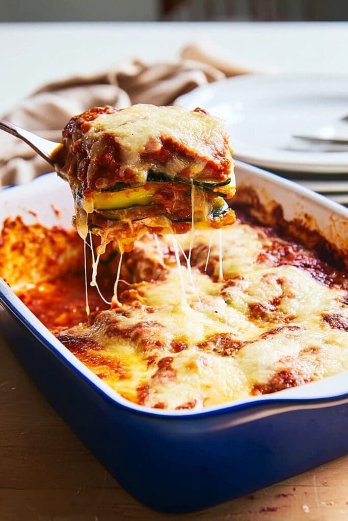 - Protein boost: Layer 1 pound cooked ground turkey between zucchini layers